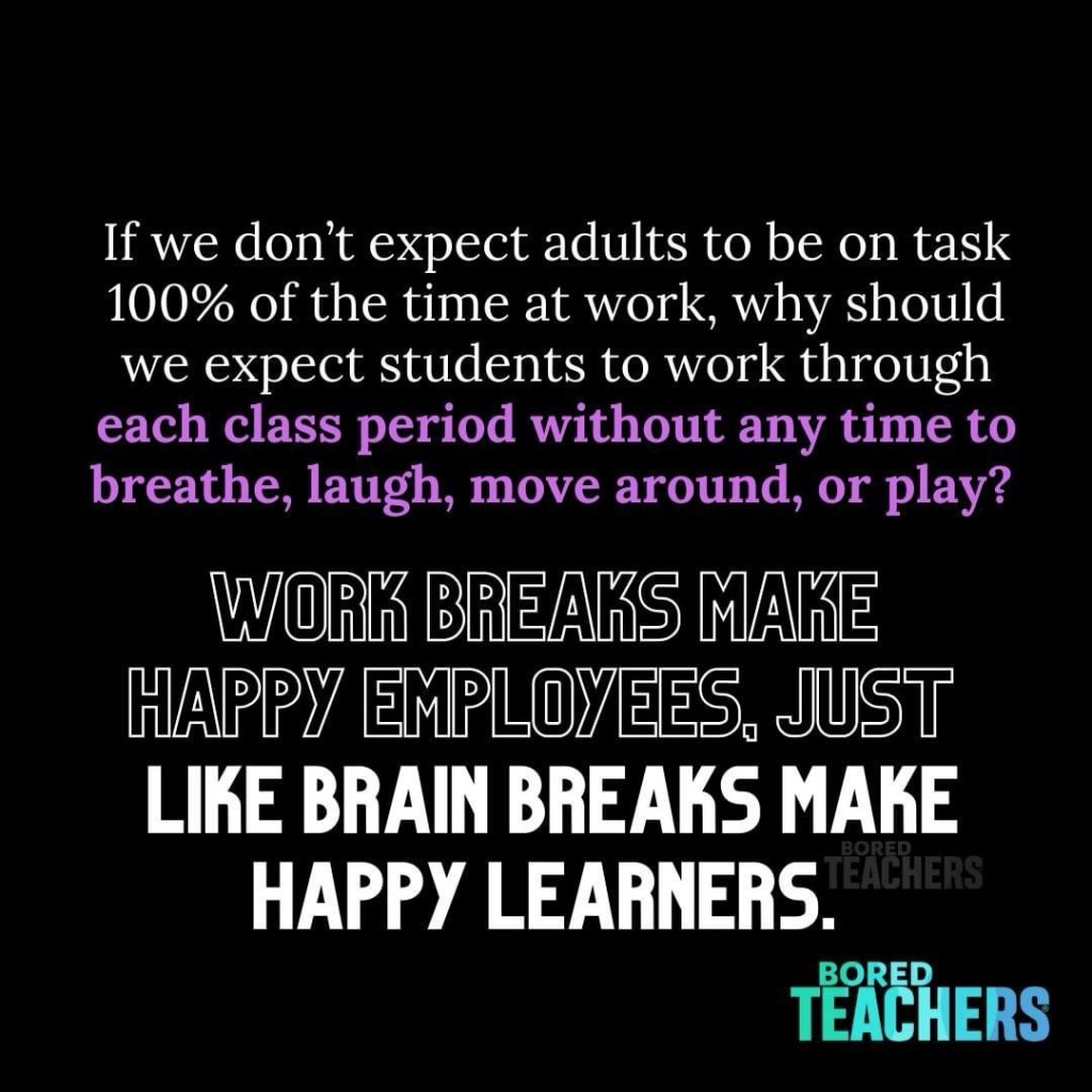 In the education world, teachers have been utilizing brain breaks more frequently and consistently. Classrooms are physically, emotionally, socially, and mentally demanding places. Teachers who provide purposeful breaks during class have fewer behavior issues and better performing students. Let’s face it – adults take breaks at work and some regulations require employee breaks, so it stands to reason that kids need breaks just as badly as, if not worse than, adults do.