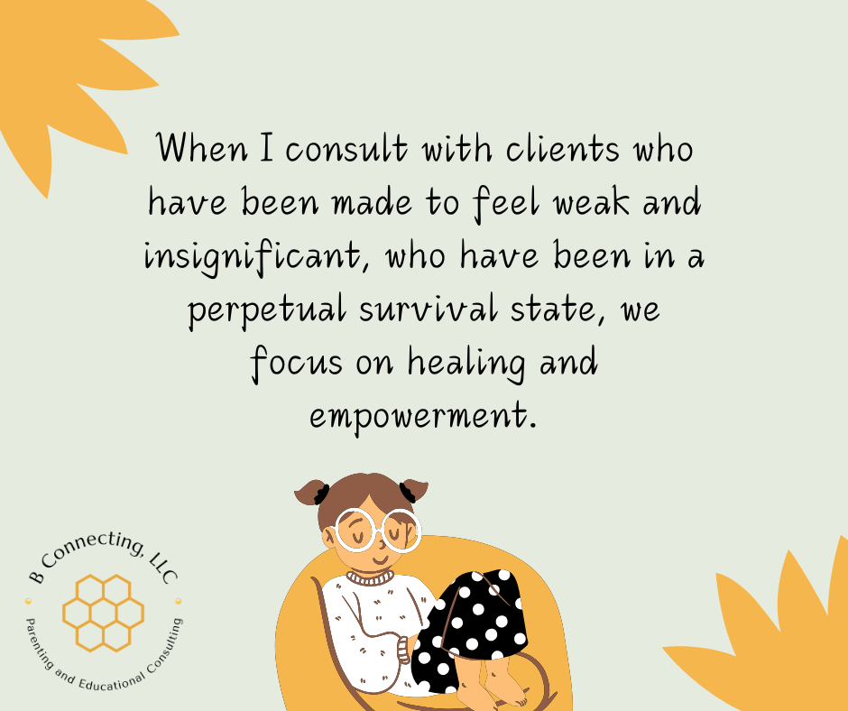 So, when I consult with clients who have been bullied, who have been made to feel weak and insignificant, who have been in a perpetual survival state, we focus on healing and empowerment. How can this person believe that she is safe? How can this person begin to understand that she deserves to be treated better? How can this person start identifying and acknowledging her strengths? How can this person get out of survival mode so she can start responding instead of reacting? It’s a time-consuming process because in addition to doing all of the necessary trauma and healing work, we also build trust, self-esteem, confidence, and other critical components of self-worth. It’s also difficult because there are setbacks, and the parts of life that are outside of our control keep happening. And some days, clients do feel defeated; but, I remind them they are not starting from square one, and they are not doing it alone.