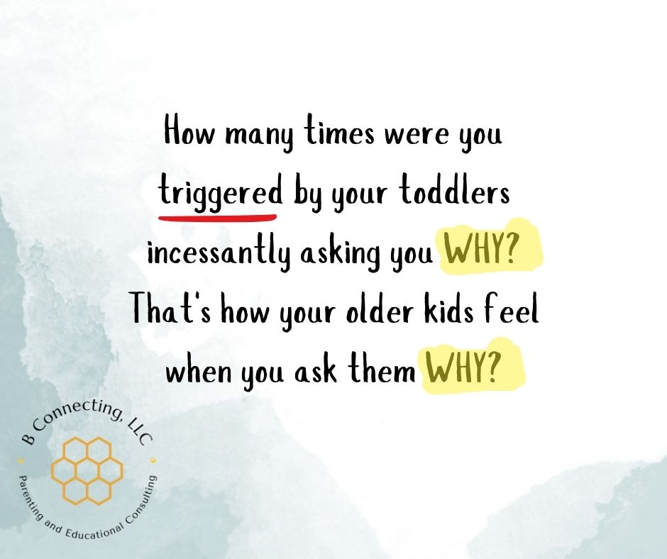 That’s one of the topics that I address with parents most frequently in consulting sessions: we want answers, and we get stuck in cycles of asking why, but most of the time, our kids truly cannot tell us. That in itself escalates the situation, and if our kids’ behaviors have angered or frustrated us, the conversation can take a turn very quickly. But, we’re parents, and we want to know what is wrong and what is going on, and we feel like we have to ask why? to get anywhere. So, how do we get to the heart of the matter?