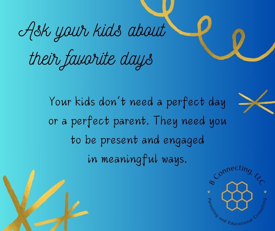 So, I think it’s a really good time to remind myself – and anyone else who needs it – that it doesn’t have to be spectacular or over-the-top for it to be meaningful and special. If we take the time to ask our kids about their favorite days, we may just be surprised by their answers; to this day, I’m still surprised that our younger son remembers making iced cookies to commemorate an accident he had because I focus much more on the accident than on how we healed from it. We often get so caught up in whether we are doing it right and whether it is enough that we miss the good things that happen each day. Our kids don’t need a perfect day or a perfect parent. What they need is for us to be present and engaged in meaningful ways every day. I’ve written before about putting down our phones, getting to our kids’ eye level when talking to them, making space for them, and truly listening to them. It’s those times when we put everything else aside and give our kids our full, undivided attention, that they feel seen and heard. That’s when we connect with them and strengthen those bonds. No wonder those are their favorite days.